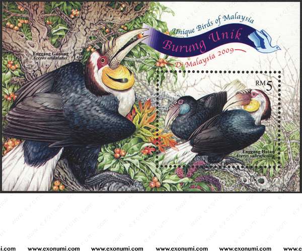 POS Malaysia has withdrawn the Unique Birds of Malaysia miniature sheet issued 21 January 2009 after it was discovered the RM5 stamp lacked the country name and date. The error occurred when last minute changes were made to the black plate to correct a spelling mistake in the bird's scientific name, Aceros subruficollis. During the editing process the country name and year were knocked out. The mistake wasn't spotted until several days after the miniature sheet had been placed on sale. There has been no official statement from POS Malaysia regarding the quantity of incorrect miniature sheets in circulation, but unofficial sources suggest up to 10,000 may have been sold (which includes standing order and first day cover customers).