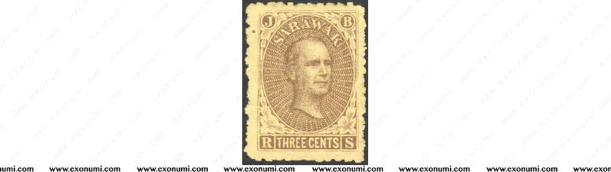 The design, consists of a three-quarter face portrait of Sir James Brooke, with head to right on an oval with an engine-turned background. Curved around the top of the head in the same oval is SARAWAK in uncoloured capital letters. At the corners fancy scrollwork is introduced and in the top ones the letters J and B appear at the left and right respectively in small circles. At the base the value THREE CENTS is shown in incoloured letters on a rectangular tablet, and in squares on each side of this are the letters R to the left and S to the right. These letters of course stand for James Brooke, Rajah of Sarawak. The whole is enclosed in a single line upright rectangular frame measuring 18¾ mm by 26½ mm.