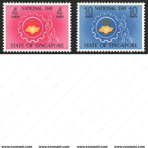 Singapore celebrated its first national day as a self-governing state on 3rd June 1960. The occasion was commemorated aptly with two stamps featuring the new state flag.