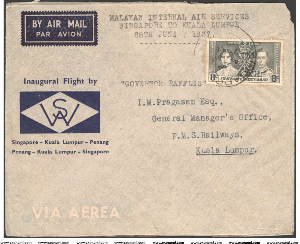 Inaugural Internal Air Services 1937 Wearne's Air Services - FFC from Singapore to Kuala Lumpur, FMS - Coronation 1937 8¢