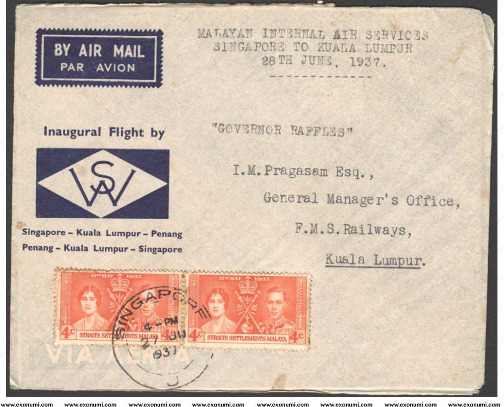 Inaugural Internal Air Services 1937 Wearne's Air Services - FFC from Singapore to Kuala Lumpur, FMS - Coronation 1937 4¢
