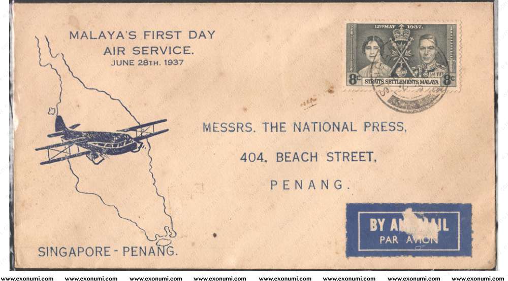 Malaya - Inaugural Air Services 1937 (First Flight Cover) Wearne's Air Services from Singapore to Penang