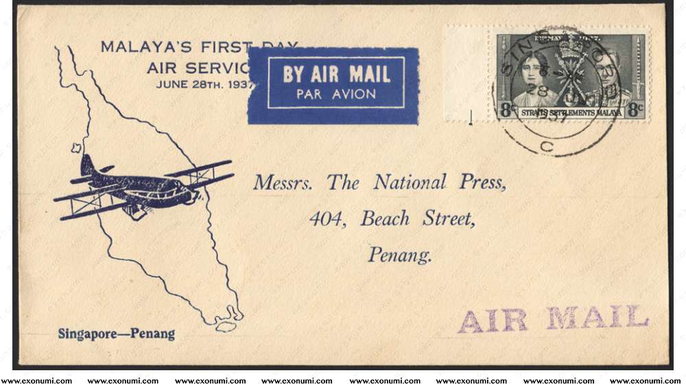 Malaya - Inaugural Air Services 1937 (First Flight Cover) Wearne's Air Services from Singapore to Penang