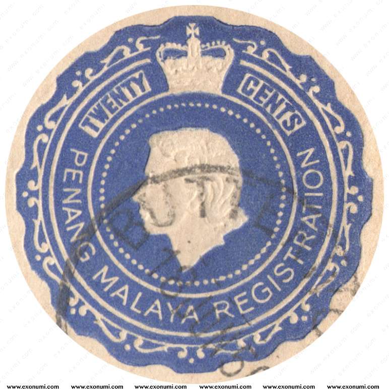 Penang, Malaya : Queen Elizabeth II : USED Prepaid Registered Envelope 20¢ + 10¢ Size G (1956)