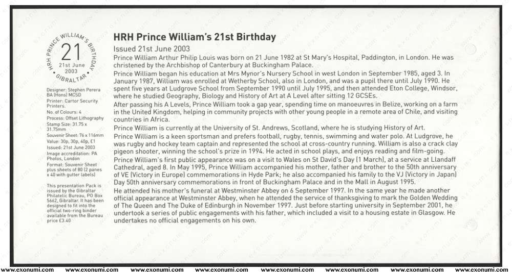 Gibraltar - Prince William 21st Birthday (2003) MS