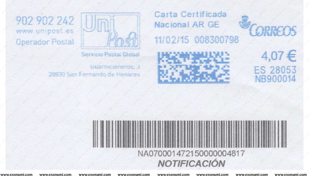 Spain - National Registered Mail - Processed by UniPost (2015)