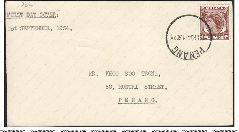 Malaya : Penang - Queen Elizabeth II 4¢ (1954) First Day of Issue on Card