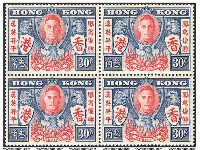Hong Kong - Victory Issue : King George VI & Phoenix (1946) Block of 4
