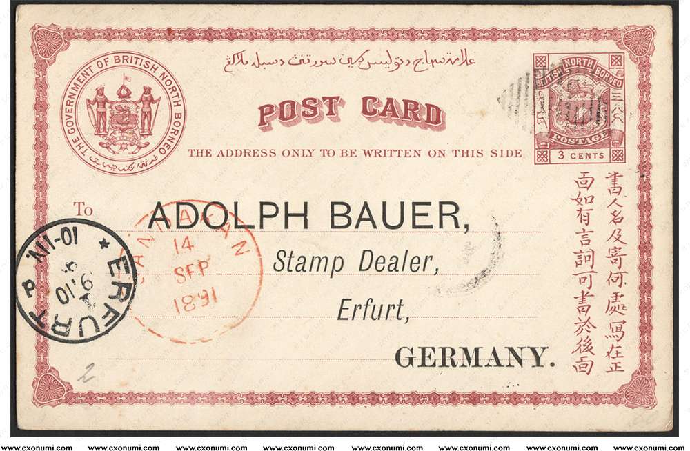 British North Borneo -3 Cent : From Sandakan to Erfurt, Germany (1891)