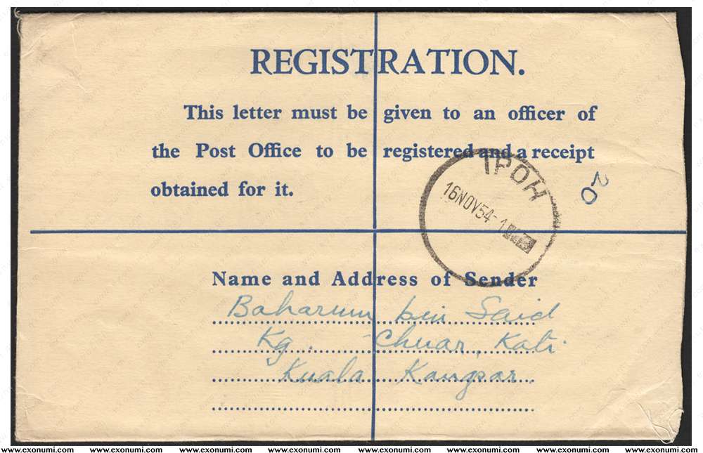 Malaya : Perak - Size G Registered Mail 20¢ + 15¢ from Kuala Kangsar to Ipoh (1954)