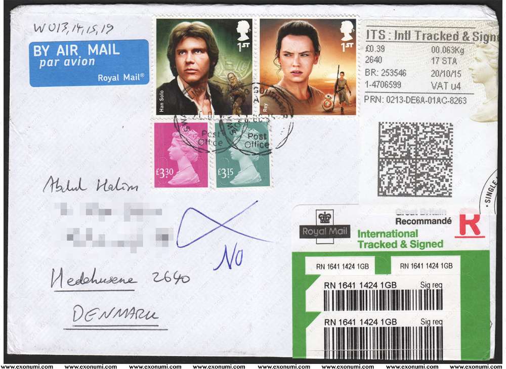 Denmark - Registered Mail from Great Britain (2015) with Star Wars Stamps