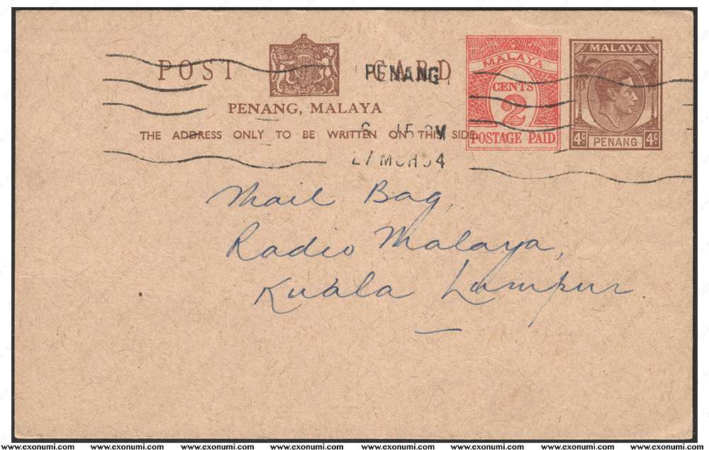 Malaya : Penang - 4¢ King George VI + 2¢ Imprint Uprated, Used in 1954