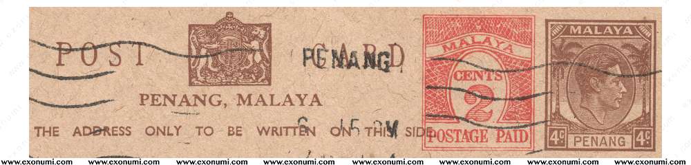 Malaya : Penang - 4¢ King George VI + 2¢ Imprint Uprated, Used in 1954