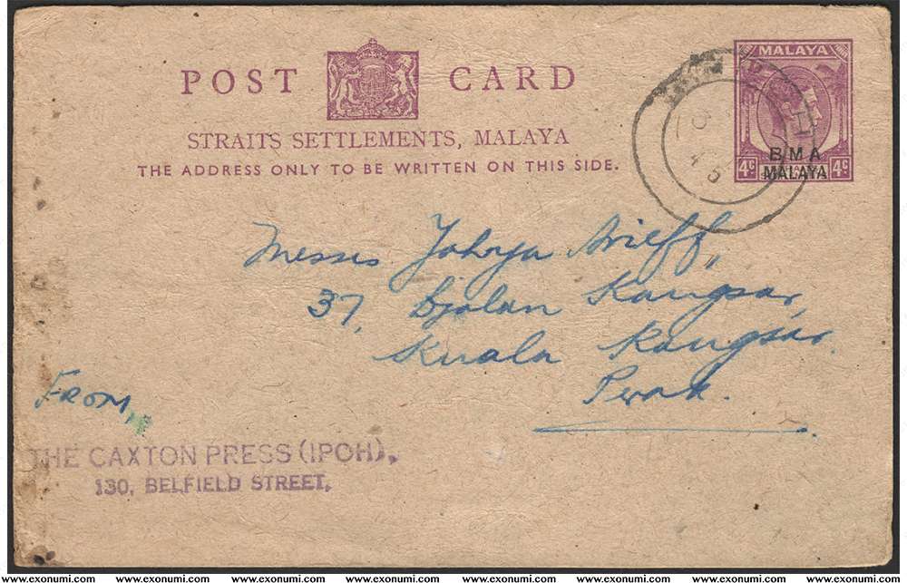 Malaya : British Military Administration (BMA) - 4¢ Postcard, Used in 1945