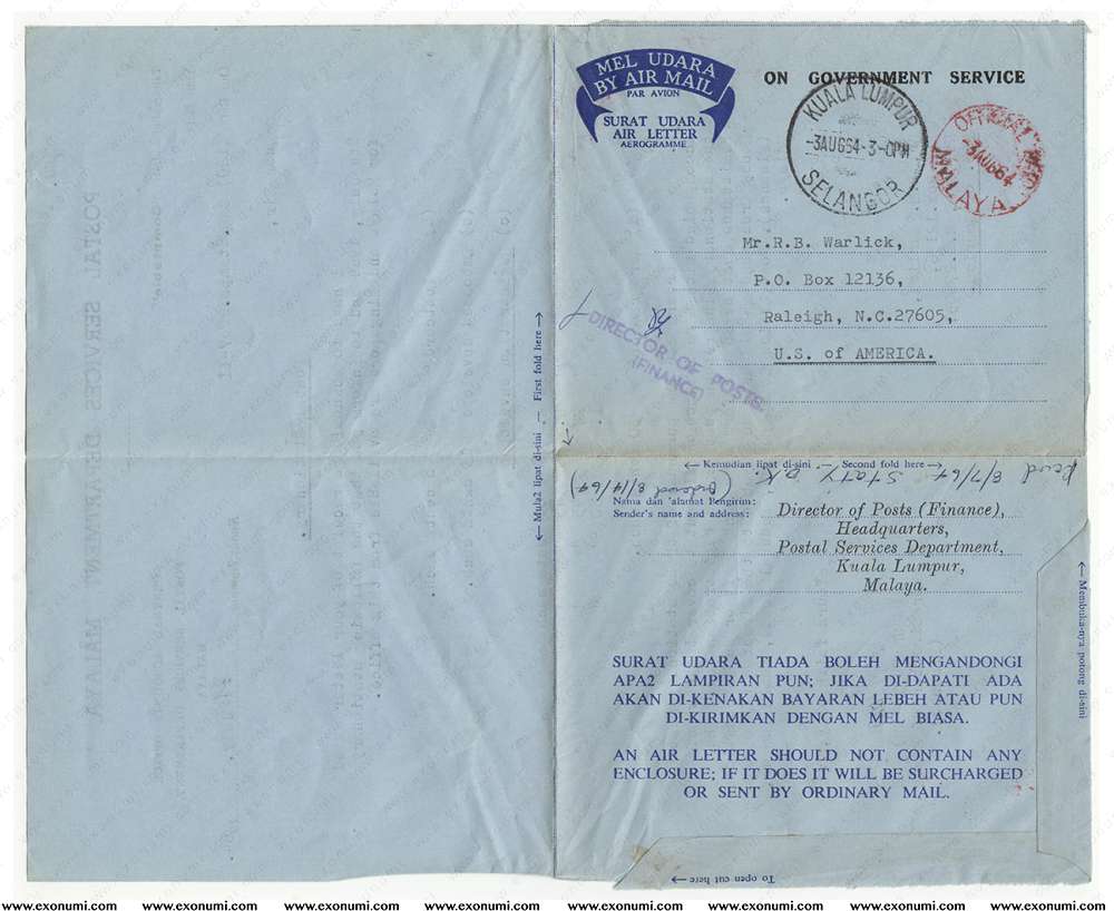 Malaysia - Official Aerogramme, Used in 1964 to the USA