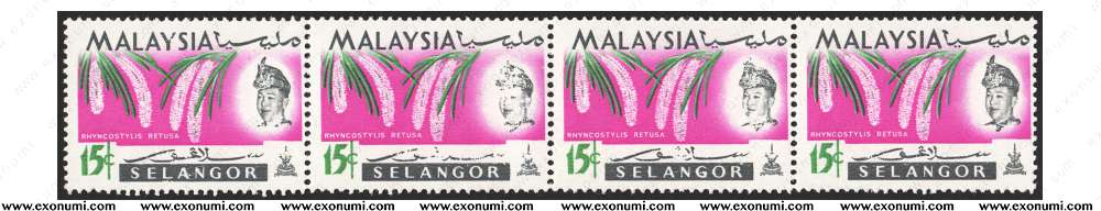 Malaysia - Selangor (1965) Orchids 15¢ - ERROR - Sultan's Head Partially Omitted (Strip of 4)