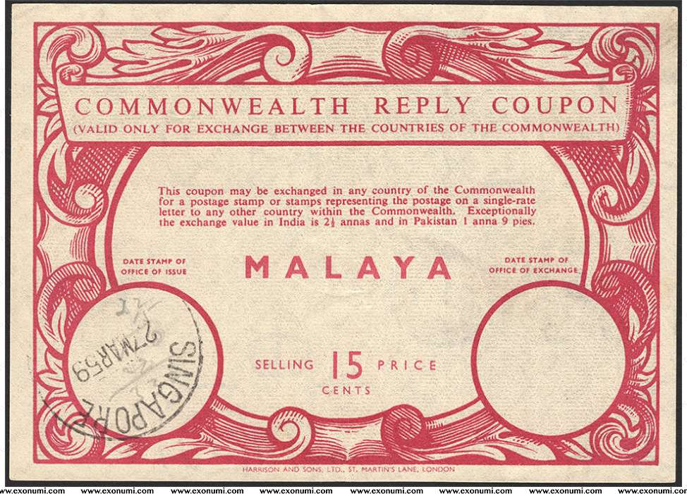 Malaya - 15 cents : Commonwealth Reply Coupon (1959) Model Barbados Type IX
