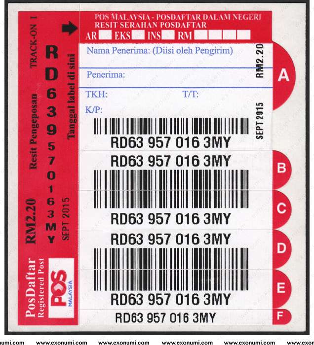 Malaysia PosDaftar Track-On 1 (Red : Registered Domestic) Sept 2015