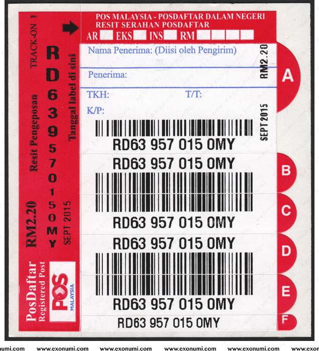 Malaysia PosDaftar Track-On 1 (Red : Registered Domestic) Sept 2015