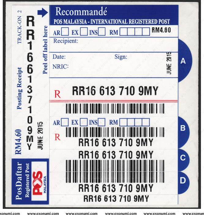 Malaysia PosDaftar Track-On 2 (Blue : Recommandé - International Registered Post) June 2015