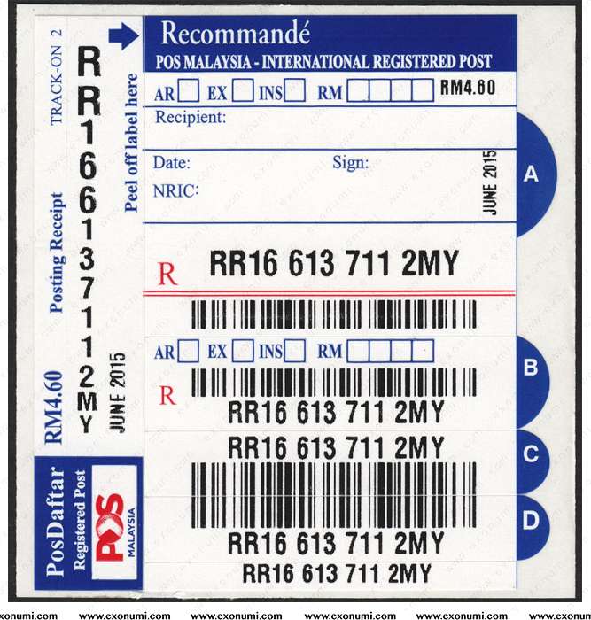 Malaysia PosDaftar Track-On 2 (Blue : Recommandé - International Registered Post) June 2015