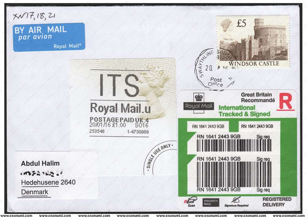 Denmark - Registered Mail from UK with 'Pre-cancelled' Horizon Label & £5 Castle Series (2016)