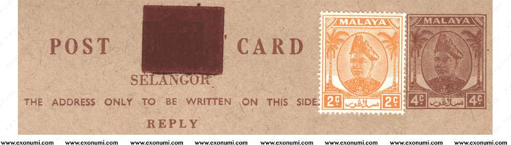 Malaya : Selangor - Postcard with Reply : Portrait of Sultan Hisamuddin Alam Shah, Uprated with 2¢ Postage Stamp, Coat-of-Arms Blocked (1951)