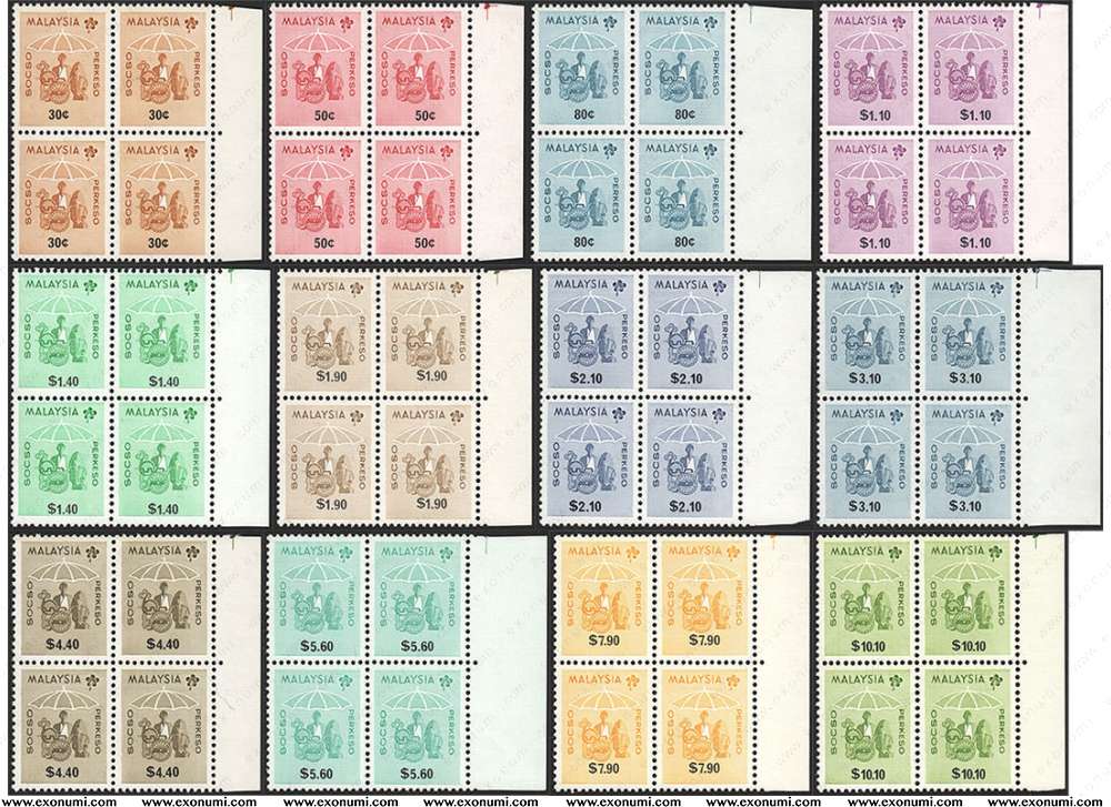 Malaysia - SOCSO Perkeso Revenue Stamps : Block of 4 (1973 London Print) Complete 12 Values