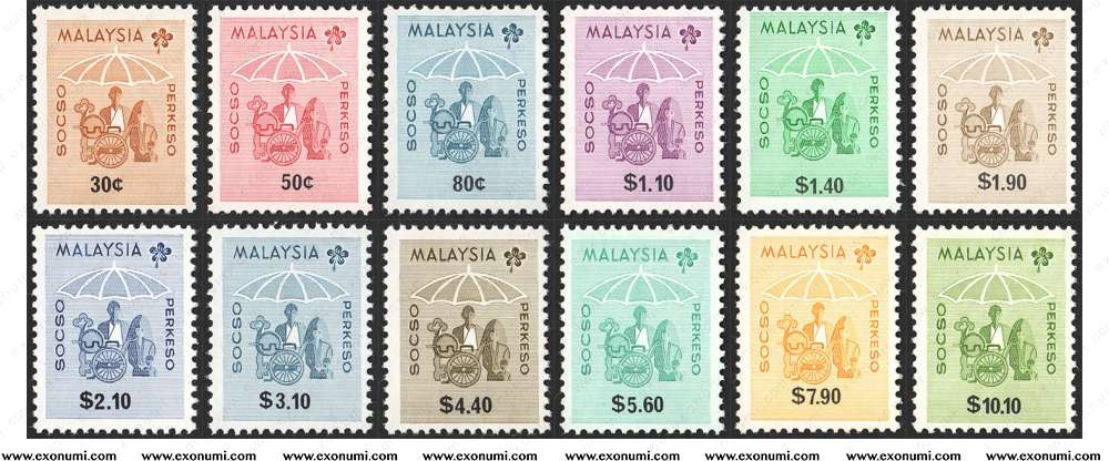 Malaysia - SOCSO Perkeso Revenue Stamps (1973 London Print) Complete 12 Values
