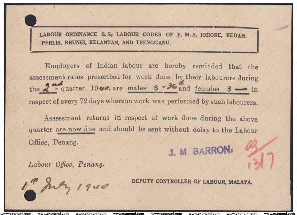 Malaya - Official Postcard from Labour Office, Penang (1940)