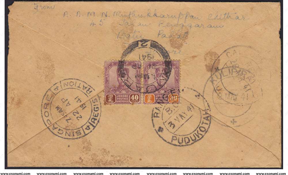 Registered Cover from Muar, Johor to Pudukotah, India (1941)