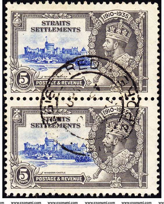 Straits Settlements - King George V Silver Jubilee 1910-1935 (Pair of 5¢ Used for Registered Mail)