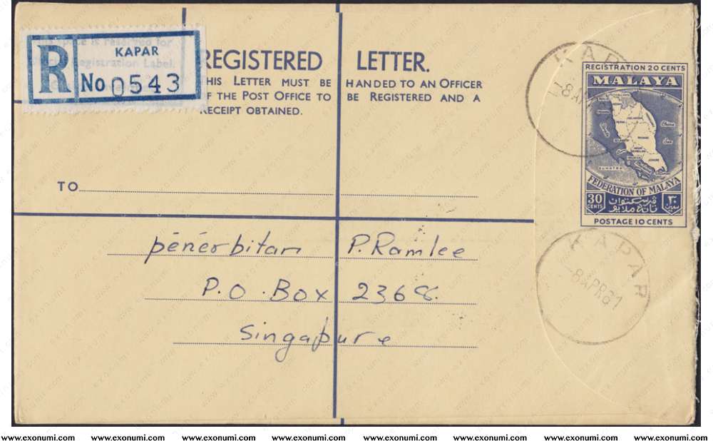 Federation of Malaya - Registered Letter (G Size) - Kapar to Singapore (1961)