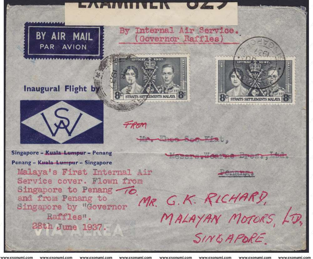 Inaugural Internal Air Services 1937 Wearne's Air Services - FFC from Singapore to Penang and Re-routed to Singapore