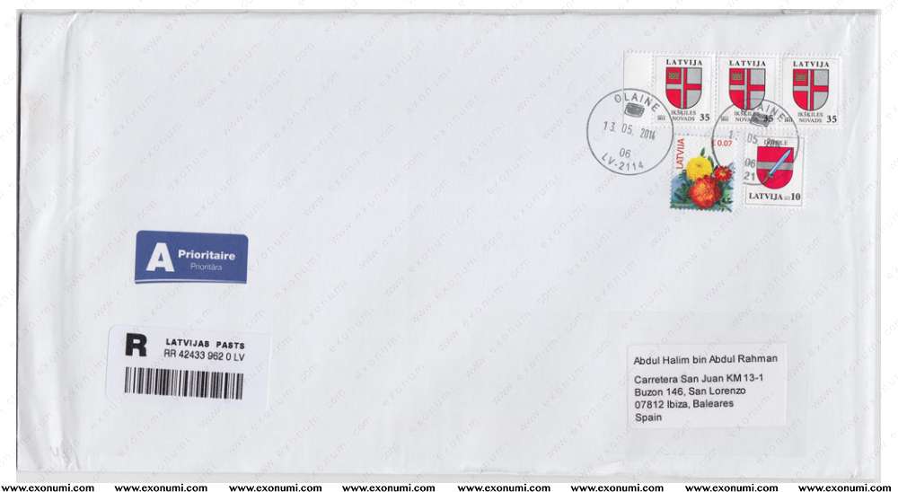 Spain - Registered Cover from Latvia (2014)