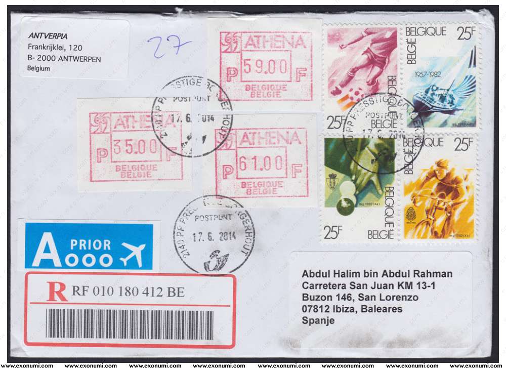Spain - Registered Cover from Belgium (2014) with mixed ATM Stamps