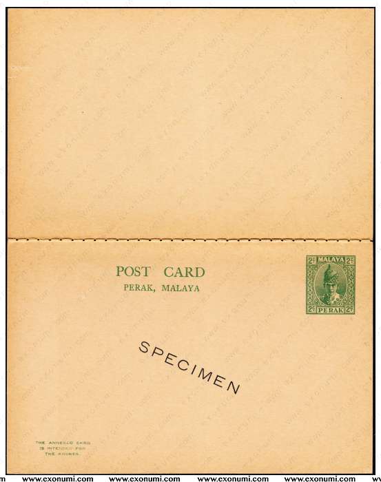 Sultanate of Perak - Postcard 2¢ + 2¢ Reply (1938) SPECIMEN