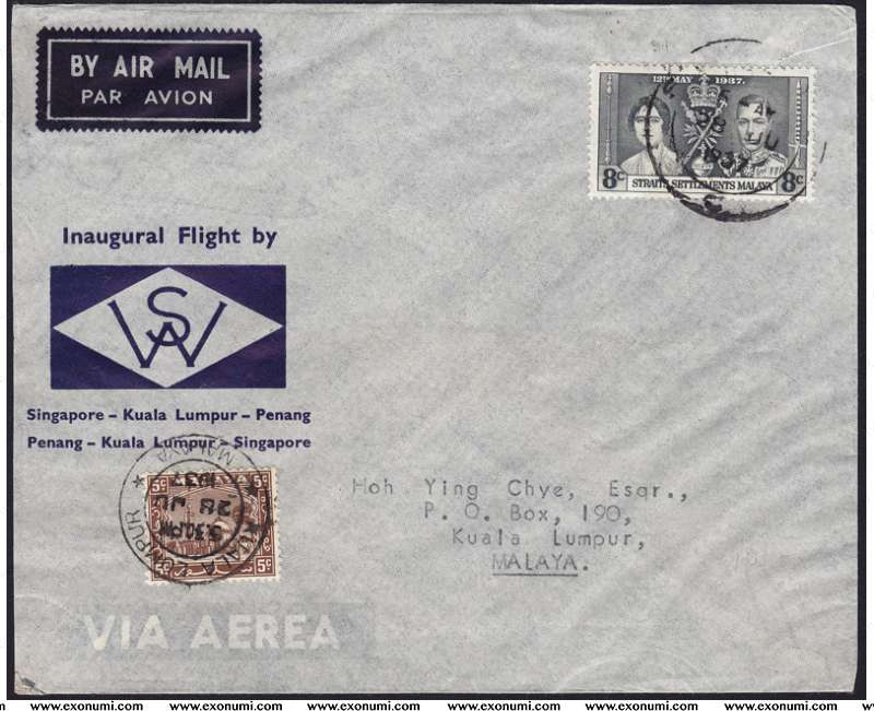 Inaugural Internal Air Services 1937 Wearne's Air Services - FFC from Singapore to Kuala Lumpur, FMS