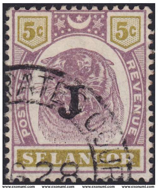 Sultanate of Selangor - 5¢ Postage Stamps of 1895-1898, Overprinted 'J' in Black (Used in 1928)