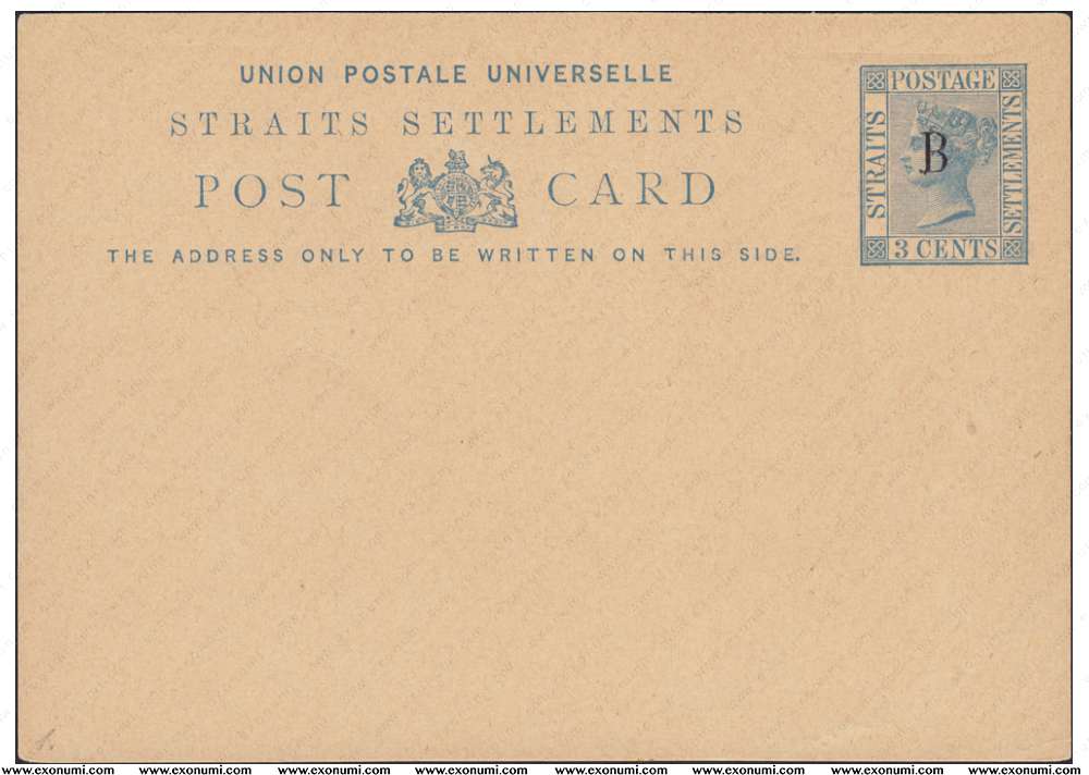 Bangkok British Post Office - Overprinted 'B' on Straits Settlements 3¢ Postcard (1882-1885)