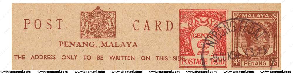 Malaya : Penang - King George VI : Postcard 4¢ + Uprated 2¢ (1954)