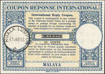 Malaysia - International Reply Coupon : London Design XV-A - Uprated 30¢ to 32¢ (1955) Kuala Lumpur