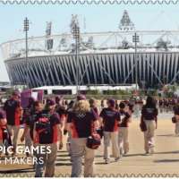 An image of Games Makers in front of the iconic Olympic Stadium