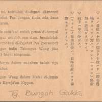 | 1. Kad ini boleh-lah di-dapati di-mana2 Pejabat Pos dengan tiada ada kena bayaran. 2. Apabila satu kad sudah penoh di-tampal dengan sepuloh sen stem, hendak-lah di-serahkan di-Pejabat Pos (bersama2 dengan buku Tabongan Wang jika ada) bagai simpanan. 3. Faedah-nya dalam satahun ia-lah tiga peratus. 4.Tabongan Wang dalam Malai di-jamin oleh Keraja'an Nippon. |