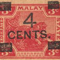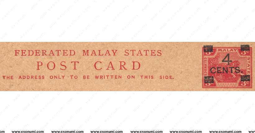 Federated Malay States - Postcard (1918) '4 CENTS.' Overprinted on 3¢ in Black & Original Values Cancelled by Four Rectangles