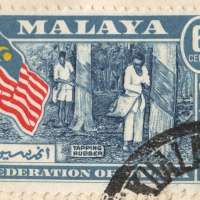 | 6 ¢ | 13 | Deep Blue, Red, Yellow & Grey-blue | Rubber Tapping | Postcard |