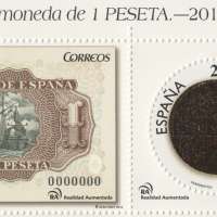 The new stamp series dedicated to the Numismatic consists of two stamps showing, respectively, the back of a peseta, 1953, and the obverse of a coin of 1 pesetas, 1944. Both values are joined by the teeth and incorporate technology of Augmented Reality (AR) that captured via smartphone, refers to an animation and informative video about making notes and coins by the Fábrica Nacional de Moneda y Timbre (FNMT). In the round seal a slight relief is appreciated, and the printing system has added cool simulating metallic stamping coins.