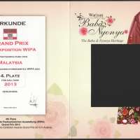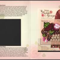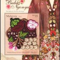 The Nyonya Kebaya first appeared only in early 20th century. These early versions featured rather simple work but later, especially from 1060s onwards, a more exquisite and intricate embroidery began to emerge. While the early Kebayas are hand sewn, the Nyonya Kebaya today is embroidered using the sewing machine with flower motives being the favourite theme. The miniature sheet features a composition of Malaysian fruit motifs with the creative use of contrasting colours. The Kebaya featured won the UNESCO Award of Excellence for Handicraft 2012.