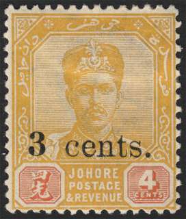 Sultanate of Johore : Sultan Ibrahim - Surcharged 3¢ on 4¢ & Cancellation Bar Omitted (1903)