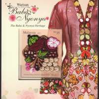 The Nyonya Kebaya first appeared only in early 20th century. These early versions featured rather simple work but later, especially from 1060s onwards, a more exquisite and intricate embroidery began to emerge. While the early Kebayas are hand sewn, the Nyonya Kebaya today is embroidered using the sewing machine with flower motives being the favourite theme. The miniature sheet features a composition of Malaysian fruit motifs with the creative use of contrasting colours. The Kebaya featured won the UNESCO Award of Excellence for Handicraft 2012.